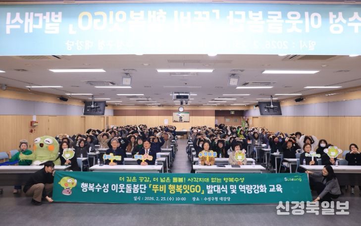 ‘뚜비행복잇고(GO)’ 이웃돌봄단은 올해 처음 조직됐으며, 고독사 위험이 있는 취약계층 가구를 정기적으로 찾아가 안부를 확인하고 맞춤형 복지 서비스를 연계하는 역할을 맡는다. 이날 행사는 위촉장 수여, 선서문 낭독, 단원 역량 강화를 위한 전문 교육 등으로 구성됐다. 수성구 대표 캐릭터 ‘뚜비’도 행사에 참석해 단원들을 격려했다.