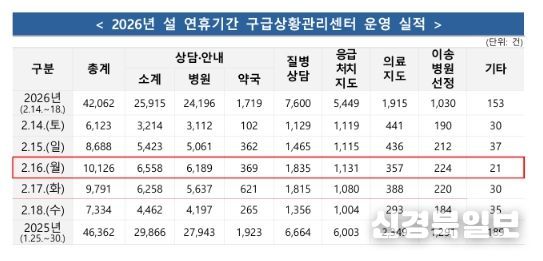 [ 신경북일보 ] 소방청은 2026년 설 연휴 기간(2.14.~2.18., 5일간)전국 총 45,082건의 구급 출동으로 24,166명을 이송하였으며, 구급상황관리센터에서 총 42,062건의 상담을 실시했다고 밝혔다.