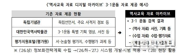 또한, 학생의 탐구 역량을 키우는 역사 수업 활성화를 위해 ‘탐구 중심 역사 교육과정 운영 사례집’(’26. 3종→’27. 9종)을 개발·보급한다. 더불어, 각종 기관·누리집(플랫폼) 등에 분산된 근현대 사료와 교육자료, 체험 자료 등을 수업에 즉시 활용할 수 있도록 교사에게 묶음(패키지) 형태로 제공하는 ‘역사교육 자료 아카이브’를 구축(ʹ27)할 예정이다.
