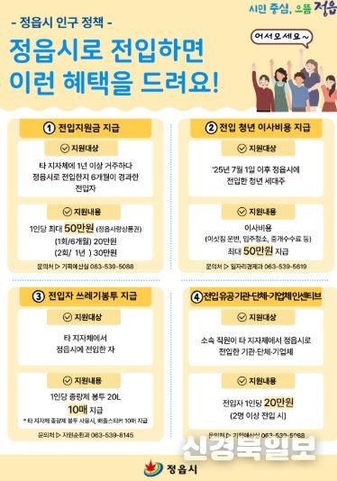 먼저 시는 타 지자체에서 정읍으로 터전을 옮기는 시민들을 위해 전입지원금을 대폭 상향했다. 기존 15만원이었던 지원금을 최대 50만원으로 확대해 전입 후 6개월이 지나면 20만원, 1년이 경과하면 30만원 등 총 2회에 걸쳐 정읍사랑상품권으로 지급한다. 변경된 제도는 2025년 7월 1일 이후 전입자부터 적용된다.