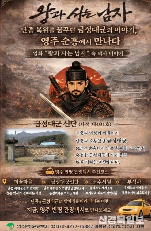 이번 추천 코스는 조선 세조 때 단종 복위를 도모하다 순절한 금성대군의 역사적 발자취를 중심으로 구성됐다. 영화 '왕과 사는 남자'가 어린 왕 단종과 그를 지키려 했던 인물들의 이야기를 담고 있는 만큼, 영주 순흥 일대에 남아 있는 관련 역사 현장을 관광택시로 편리하게 둘러볼 수 있도록 기획됐다.