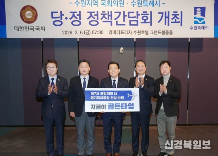 [ 신경북일보 ] 이재준 수원특례시장은 6일 라마다프라자 수원호텔에서 열린 지역 국회의원들과 당·정 정책간담회에서 “제7차 공항개발 종합계획에 ‘경기국제공항’ 건설 내용이 반영될 수 있도록, 경기도와 협의해 달라”고 요청했다.