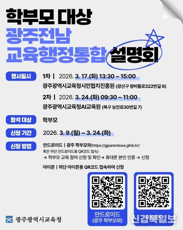 [ 신경북일보 ] 광주시교육청이 학부모의 교육행정통합 궁금증을 해소하기 위해 두 차례에 걸쳐 ‘광주·전남 교육행정통합 설명회’를 개최한다.