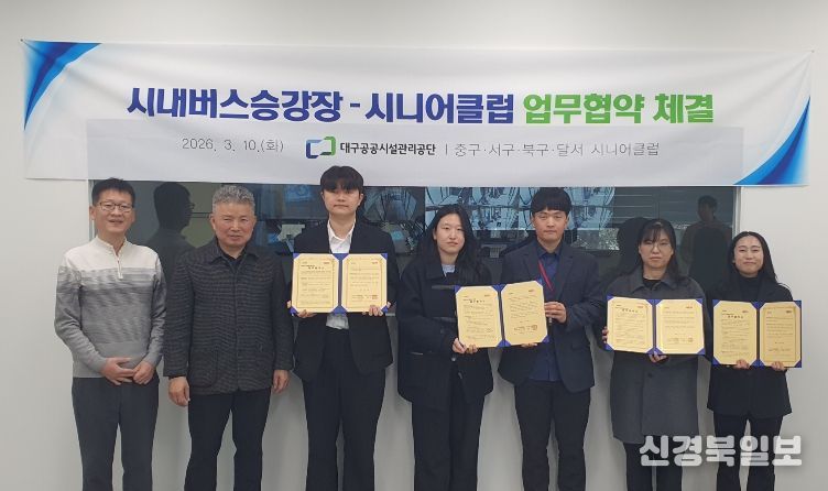 [ 신경북일보 ] 대구공공시설관리공단이 지난 3월 10일 시내버스유개승강장 사무실에서 중구, 달서구, 서구, 북구 시니어클럽과 시내버스승강장 도우미 사업을 위한 협약을 맺었다.