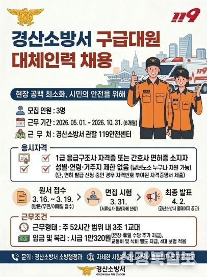 [ 신경북일보 ] 경산소방서가 구급대원 공백을 보완하기 위해 기간제 대체인력 모집을 시작했다.