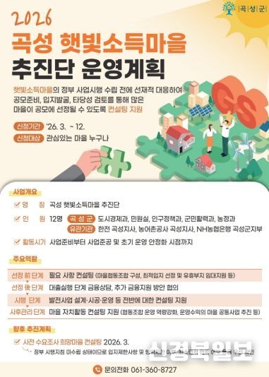 [ 신경북일보 ] 전남 곡성군이 주민참여형 태양광 발전사업인 ‘햇빛소득마을 조성사업’을 체계적으로 추진하기 위해 추진단을 출범시키고, 희망마을을 대상으로 본격적인 컨설팅 지원에 나선다고 17일 밝혔다.