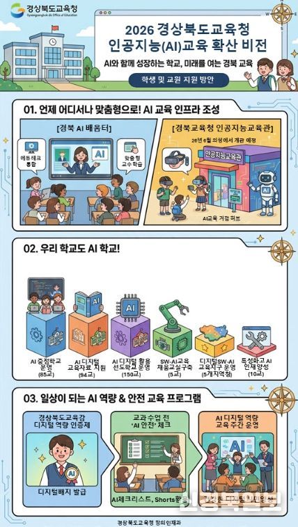 [ 신경북일보 ] 경북교육청은 ‘AI와 동행하는 따뜻한 경북교육’을 비전으로 다가오는 인공지능 시대를 주도할 미래 인재 양성을 위해 ‘2026 AI(인공지능)교육 종합계획’을 수립해 본격 추진한다고 18일 밝혔다.