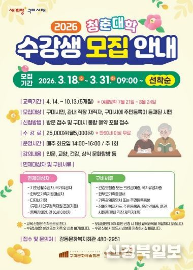 [ 신경북일보 ] 구미시강동문화복지회관이 3월 18일부터 3월 31일까지 '청춘대학' 프로그램 참가자를 모집한다.