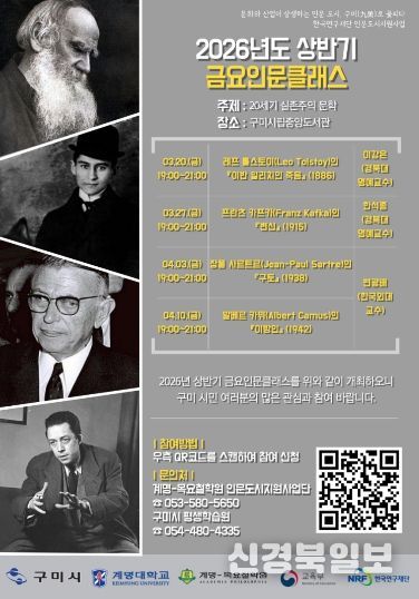 [ 신경북일보 ] 구미시와 계명대학교가 함께 운영하는 인문도시 지원사업의 일환으로 ‘금요인문클래스’가 2026년 상반기 강좌를 시작한다. 이 프로그램은 2022년부터 시민을 대상으로 공개 강좌 형식으로 마련되어, 현재 구미 지역의 대표적인 인문교양 프로그램으로 자리잡았다.