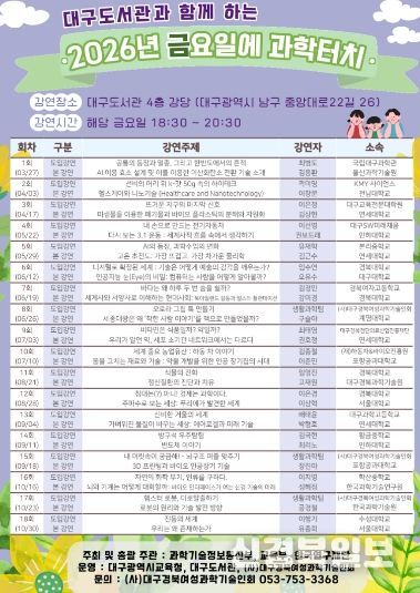 [ 신경북일보 ] 대구도서관이 시민들에게 과학기술과 연구 성과를 알기 쉽게 전달하는 '2026년 금요일에 과학터치' 강연 시리즈를 시작한다.