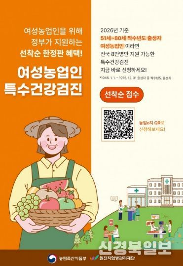 지원 대상은 포항시에 주소를 둔 51세에서 80세 여성농업인 중 2026년 1월 1일 기준 1946년생부터 1975년생까지의 짝수년도 출생자다. 신청은 ‘농업e지’ 앱을 통한 온라인 접수 또는 읍·면·동 행정복지센터 방문을 통해 가능하다.