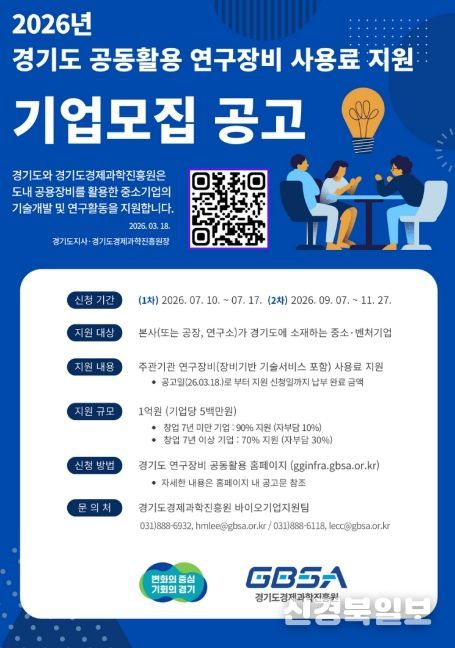 [ 신경북일보 ] 경기도와 경기도경제과학진흥원이 도내 중소·벤처기업의 연구개발(R&D) 경쟁력 강화를 위해 ‘2026년 경기도 공동활용 연구장비 사용료 지원 사업’을 추진한다.