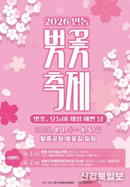 4월 1일 개막하는 ‘2026 안동 벚꽃축제’에서는 낙동강변 벚꽃길과 탈춤공원 일대가 벚꽃으로 물들며, 공연과 체험 프로그램, 야간 조명으로 꾸며진 벚꽃 터널 등 낮과 밤 모두 즐길 수 있는 행사가 마련된다.