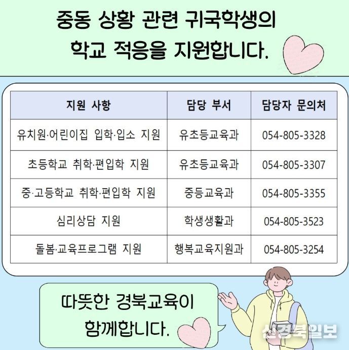 [ 신경북일보 ] 경북교육청은 최근 중동 지역 정세 불안으로 재외동포와 동반가족의 국내 입국이 이어짐에 따라, 귀국 학생의 원활한 학교 적응을 지원하기 위한 ‘중동 상황 관련 귀국 학생 지원 계획’을 수립․추진한다고 20일 밝혔다.
