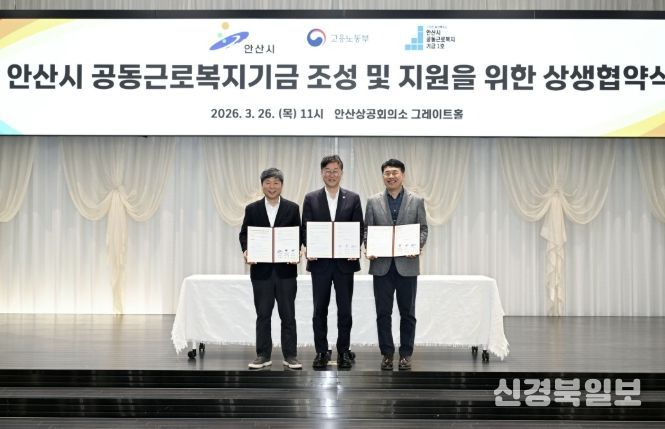 [ 신경북일보 ] 안산시는 지난 26일 안산상공회의소 그레이트홀에서 경기지방고용노동청 안산지청, 안산시 공동근로복지기금 1호 법인과 함께 ‘안산시 공동근로복지기금 조성 및 지원을 위한 상생협약’을 체결했다고 27일 밝혔다.