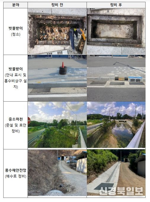 빗물받이 정비에는 326억 원이 배정되어, 장마와 집중호우 시 도심 침수의 원인이 되는 막힌 빗물받이와 연결된 관로를 집중 점검·청소하고 준설 작업도 병행한다. 중소하천 준설 및 정비에는 346억 원이 투입되어, 범람과 침수 위험이 높은 지방하천과 소하천, 세천의 물길을 확보하고, 노후된 제방과 호안, 홍수방어벽 등 시설물의 보수와 보강이 이뤄진다. 풍수해 안전망 확충에는 195억 원이 사용되어, 위험성이 높은 소규모 석축, 옹벽, 배수로, 낙석 방지시설 등 취약 지역의 시설 개선이 추진된다.