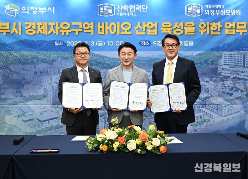 [ 신경북일보 ] 의정부시는 4월 3일 시청 회룡홀에서 가톨릭대학교 의정부성모병원, 가톨릭대학교 산학협력단과 함께 ‘의정부시 경제자유구역 바이오 산업 육성을 위한 업무협약’을 체결했다.
