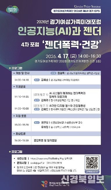 [ 신경북일보 ] 경기도여성가족재단은 오는 17일 재단 회의실에서 ‘인공지능과 젠더폭력·건강’을 주제로 4차 경기여성가족미래포럼을 개최한다. 3월부터 5월까지 총 5차례 진행하는 경기여성가족미래포럼 중 이번이 4회차다.