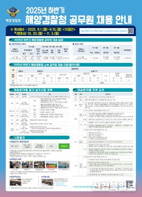 [ 신경북일보 ] 해양경찰청은 2025년 하반기 해양경찰청 경찰공무원 200명을 신규 채용한다고 밝혔다.