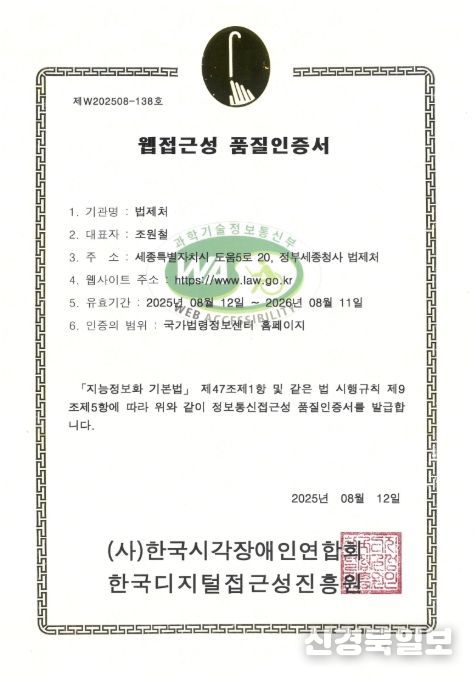 [ 신경북일보 ] 법제처는 9월 3일, 국가법령정보센터가 2년 연속 웹과 모바일 앱 모두 접근성 품질인증을 획득했다고 밝혔다. 2024년에 처음으로 웹과 모바일 앱 모두 인증을 획득한 데 이어, 올해도 정보취약계층의 접근성이 우수하다는 점을 다시 한 번 확인받은 것이다.