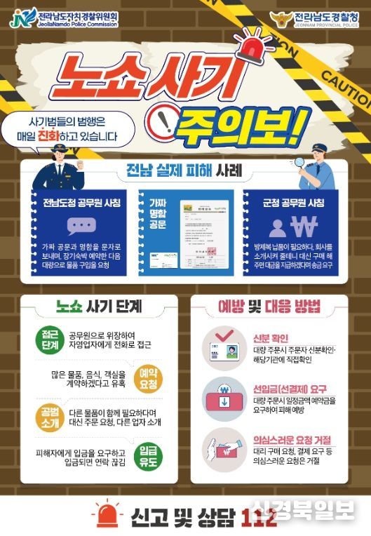 [ 신경북일보 ] 전라남도자치경찰위원회가 최근 음식점·숙박업·병원·학원·배달 등에서 예약 후 나타나지 않거나 다른 물품을 추가로 대신 주문케 하는 수법의 ‘노쇼(No-Show) 사기’ 피해가 잇따름에 따라, ‘노쇼 사기 주의보’를 발령했다.