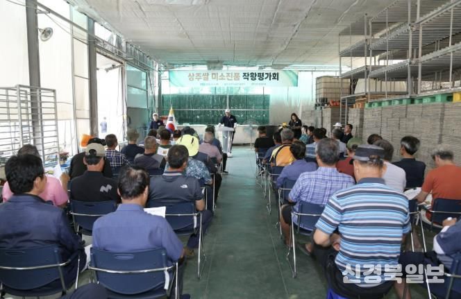 [ 신경북일보 ] 상주시는 9월 4일 성동뜰 일대에서 상주쌀연구회와 관련 공무원 65명이 참석한 가운데 상주쌀 미소진품 작황평가회와 조생종 벼베기 연시회를 실시했다.