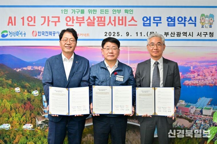 [ 신경북일보 ] 부산 서구는 지난 11일 한국전력공사, (재)행복커넥트와 고립 가구의 고독사를 예방하고자 ‘AI 1인 가구 안부살핌서비스’ 협약을 체결했다. 이 협약은 전력 및 통신 데이터를 활용해 생활 패턴을 분석하고, 이상 징후 발견 시 선제 대응하여 고독사 예방 목적으로 체결했으며, SK텔레콤의 사회적기업인 재단법인 행복커넥트의 요금 감면과 한전 중부산지사의 후원으로 서구 고립 위험군 50가구에 9월 중 시행할 예정이다.