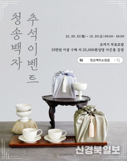 [ 신경북일보 ] 청송군의 대표 특산품인 청송백자가 9월 15일부터 10월 10일까지 온라인 쇼핑몰에서 ‘보자기 무료 포장 및 25만 원 이상 구매 시 사은품 증정 이벤트’를 진행한다.