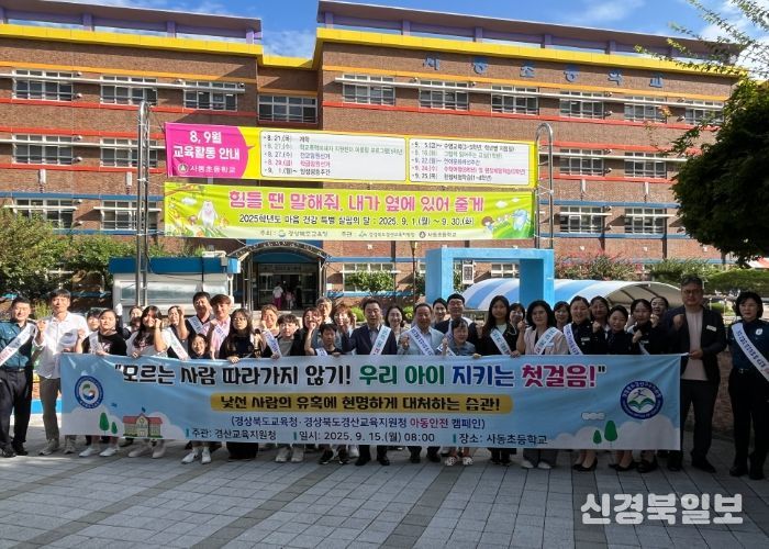 [ 신경북일보 ] 경산교육지원청은 9월 15일 8시부터 사동초등학교에서 최근 초등학교 인근 미성년자 유괴 사건 발생에 따른 유사 범죄를 예방하고, 모든 학생이 안전하고 건강하게 성장할 수 있는 안심 교육 환경을 조성하기 위한 범죄 예방 캠페인을 진행했다.