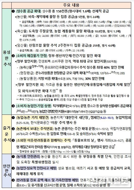 [ 신경북일보 ] 농림축산식품부는 풍성한 추석, 즐거운 추석, 안전한 추석을 주요 골자로 하는 '농업·농촌분야 추석 민생안정대책'을 마련했다고 발표했다.