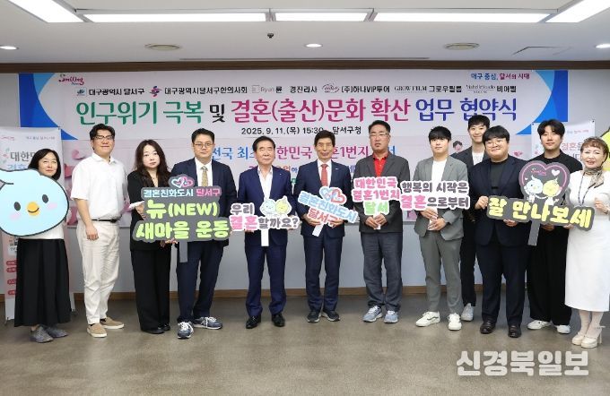 [ 신경북일보 ] 대구 달서구는 지난 11일 구청에서 대구광역시 달서구한의사회를 비롯한 6개 민간기관·단체와 결혼친화 문화 확산과 저출생 대응을 위한 업무협약을 체결했다.