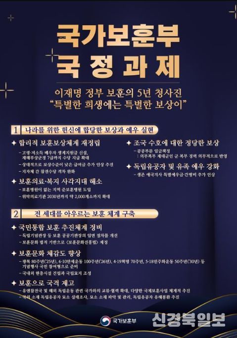 [ 신경북일보 ] 국가보훈부는 16일 새정부 국정과제로 '나라를 위한 헌신에 합당한 보상과 예우 실현', '전 세대를 아우르는 보훈 체계 구축'이 확정됐다고 밝혔다.