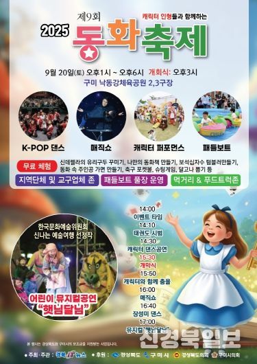 [ 신경북일보 ] 구미시와 경상북도가 후원하는 ‘2025 제9회 동화축제’가 9월 20일 오후 1시부터 6시까지 구미 낙동강체육공원 2·3구장에서 열린다.