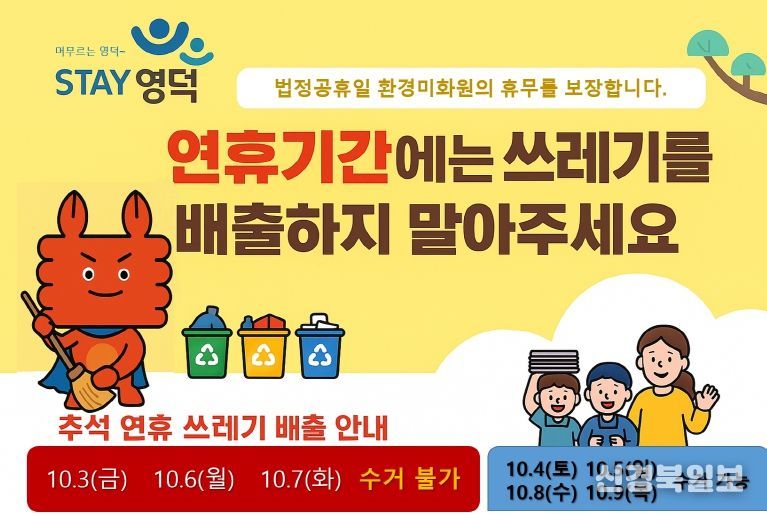 [ 신경북일보 ] 영덕군은 환경미화원의 휴무를 보장하고 업무 능률을 높이기 위해 추석 연휴 기간인 다음 달 3, 6, 7일 사흘간 쓰레기 수거 업무를 일시적으로 중단한다.