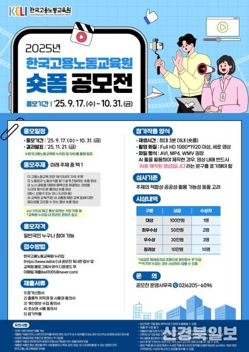 [ 신경북일보 ] 고용노동부 한국고용노동교육원은 9월 17일부터 국민 누구나 참여할 수 있는 '2025년 대국민 숏폼 공모전'을 개최한다. 이번 공모전은 짧고 참신한 영상 콘텐츠를 통해 노동문화의 가치를 널리 알리고, 국민과의 소통을 강화하기 위해 기획됐다.