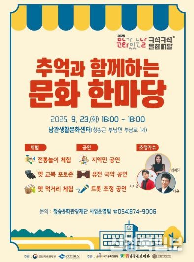 [ 신경북일보 ] (재)청송문화관광재단은 오는 9월 23일 오후 4시부터 6시까지 부남면에 위치한 남관생활문화센터에서 2025 문화가 있는 날 ‘구석구석 문화배달’ 프로그램의 일환인 ‘추억과 함께하는 문화한마당’을 개최한다.