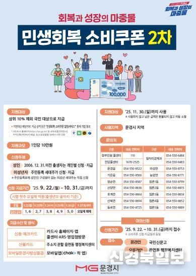 [ 신경북일보 ] 문경시는 오는 22일부터 지역 내 소비 진작과 지역경제 활성화를 위해 2차 민생회복 소비쿠폰을 접수·지급한다.