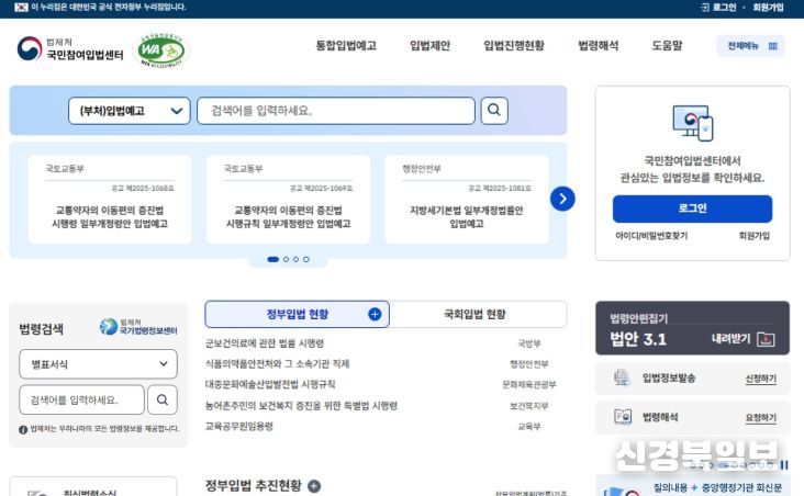 [ 신경북일보 ] 법제처는 9월 19일, 국민이 입법추진 현황 등 정부입법 관련 정보를 보다 쉽고 편리하게 확인할 수 있도록 기존 국민참여입법센터를 전면 개편하고, 정부입법지원센터를 ‘국민참여입법센터’로 통합하여 새롭게 서비스를 시작한다.