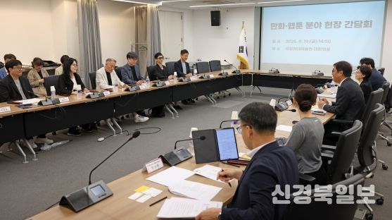 [ 신경북일보 ] 문화체육관광부 최휘영 장관은 9월 19일 오후, 국립현대미술관 서울관에서 ‘웹툰업계 간담회’를 열어 웹툰 업계 현장 전문가들의 의견을 청취하고 웹툰 산업의 지속 가능한 발전을 위한 지원 방안을 모색했다. 이번 간담회에는 이현세 작가 등 창작자를 비롯해 주요 협회·단체, 플랫폼·제작사 관계자 등이 참석했다.