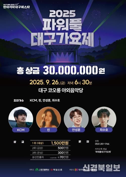 [ 신경북일보 ] 대구광역시는 오는 9월 26일 오후 6시 30분, 코오롱 야외음악당에서 전국의 재능 있는 음악인들에게 무대의 기회를 제공하고, 시민과 함께하는 가요경연 축제인 ‘2025 파워풀 대구가요제’를 개최한다.