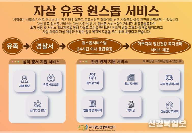 [ 신경북일보 ] 구미시는 7월부터 자살로 갑작스럽게 가족을 잃은 유족들의 고통을 신속히 완화하고 안정적인 일상 복귀를 위해 '자살 유족 원스톱 서비스'사업을 본격 운영하고 있다.