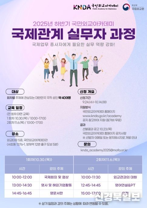 [ 신경북일보 ] 외교부 국립외교원은 2025년 하반기 국민외교아카데미 국제관계 실무자 과정 참가자를 9월 24일부터 10월 14일까지 모집한다.