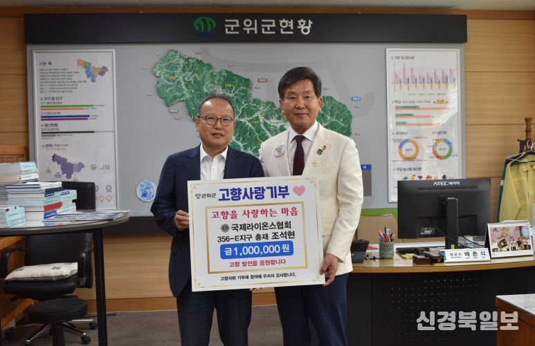 [ 신경북일보 ] 군위군은 국제라이온스협회 356-E(경북)지구 조석현 총재(제38대)가 지난 23일 군위군청을 방문하여 고향사랑기부금 100만원을 전달했다고 밝혔다.