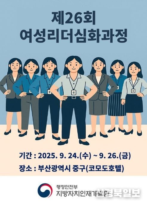 [ 신경북일보 ] 행정안전부 지방자치인재개발원은 9월 24일부터 9월 26일까지 부산광역시에서 지방자치단체 여성공무원 200여 명을 대상으로 ‘제26회 여성리더심화과정’을 운영한다고 밝혔다.