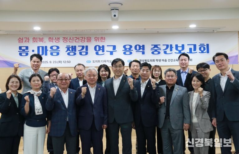 [ 신경북일보 ] 경북도의회 의원연구모임'경상북도 학생마음 건강교육 정책연구회'(대표 황두영 의원)는 23일(화) 도의회 다목적실에서 '쉼과 회복, 학생 정신건강을 위한 몸·마음 챙김 연구' 중간보고회를 개최했다.