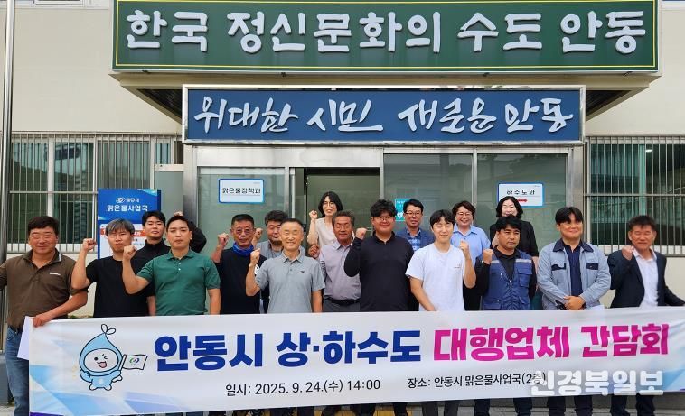 [ 신경북일보 ] 안동시는 9월 24일 맑은물사업국 2층 국장실에서 상․하수도 대행업체 10개 사 대표들과 맑은물사업국 직원 등 20여 명이 참석한 가운데, 사업 품질향상 및 상호협력 강화를 위한 ‘상․하수도대행업체 간담회’를 개최했다.