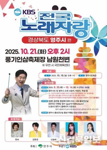 [ 신경북일보 ] 영주시는 오는 10월 21일 오후 2시, 풍기인삼축제장 남원천변에서 ‘KBS 전국노래자랑–영주시편’ 본선 녹화를 진행한다고 밝혔다.