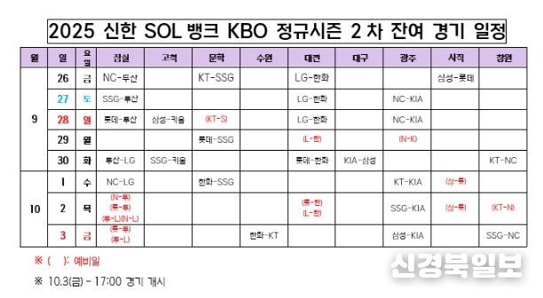[ 신경북일보 ] KBO는 26일(금) 2025 신한 SOL뱅크 KBO 정규시즌 2차 잔여 경기 일정을 확정했다.