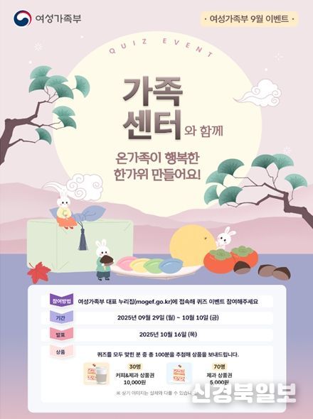 한편, 여성가족부 대표 누리집에서는 추석을 계기로 ‘가족센터 초성 퀴즈’ 행사(9.29.~10.10.)를 진행한다.