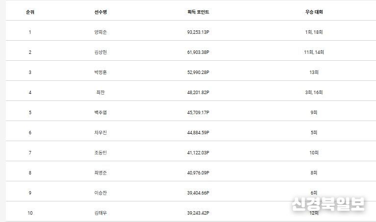 2위 김상현과 10위 김태우(27.(주)하이니스임플란트)의 포인트 격차는 22,659.96포인트다. 또한 10위 김태우와 13위 이승형(22), 17위 김범수(27)와 포인트 차는 각각 10,221.45포인트, 12,766.24포인트다. 10위 김태우와 20위 하충훈(35.㈜일신테크놀로지)와 차이는 16,500.06포인트다.